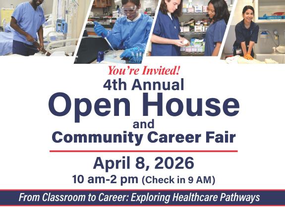 Open House also spotlights the college’s premier programs—including Nursing and Healthcare and our Career and Technical Education pathways—and features an industry panel, tours of our nursing building, immersive simulation labs, mobile career exploration labs, and a community career fair with up to 40 companies actively hiring.
