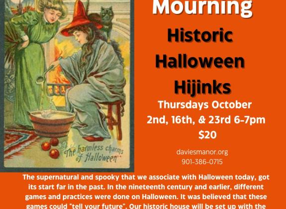 The supernatural and spooky that we associate with Halloween today, got its start far in the past. In the nineteenth century and earlier, different games and practices were done on Halloween. It was believed that these games could "tell your future". Join us the first four Thursdays in October as we explore those historic Halloween hi-jinks meant to "foretell the future". Our historic house will be set up with the Manor in Mourning exhibit showcasing mourning practices from the nineteenth century. These tours will offer a chance to view the exhibit after hours while also trying out some Halloween Hi-jinks of your own! Buy tickets https://square.link/u/3O81fvtF.