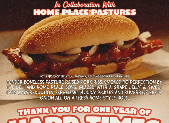 Come celebrate Hard Times Deli’s 1-year anniversary with the new McWib! In collaboration with Home Place Pastures, the Hard Times Deli & Home Place Pastures team will be slanging McWibs in the parking lot and inside while supplies last.
