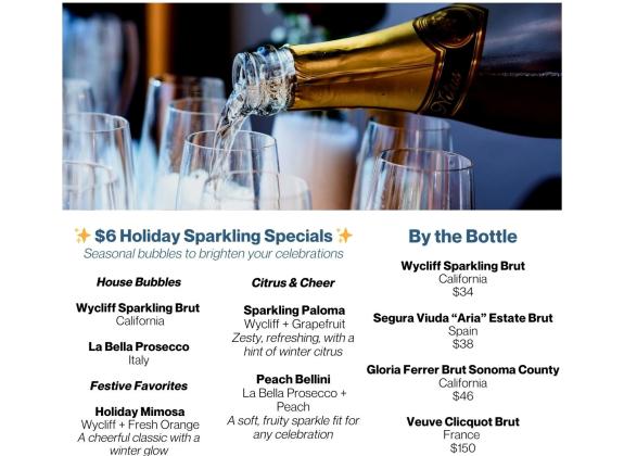 Sip your way into the New Year on the Mississippi River at Terrace at the River Inn, where sweeping river views and fireworks light up the countdown. Enjoy $6 holiday sparkling specials all night, bubbles-by-the-bottle deals, and $8 small plates. No reservations are needed—just come ready to celebrate.