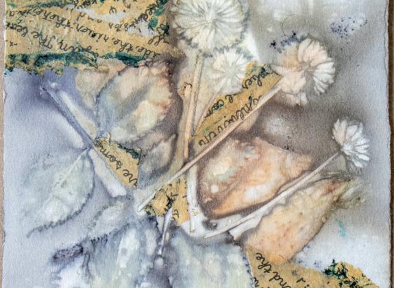 Self-described “artist, educator, storyteller, collector, and sometime writer” Mary K VanGieson creates prints, sculptures, and installations using alternative materials such as coffee filters and foraged plants as ways to investigate themes including loss, erosion, and the transitory. Chasing the Ephemeral features eco prints made by layering organic materials including leaves, plants, and onion skins between sheets of plain, unmarked Stonehenge paper. Bundled tightly around a rusty can or clamped between pieces of scrap wood, the paper and plants are boiled for hours in water and vinegar, resulting in the transfer of shapes and colors derived from the vegetation to the paper. Tannin-rich foliage works best, creating natural colors that bind with and dye fibers in the paper. For this exhibition, the artist sourced plants and leaves including avocado, eucalyptus, maple, oak, redbud, rose, sumac, and willow, from her own home and yard and from the Dixon’s gardens.